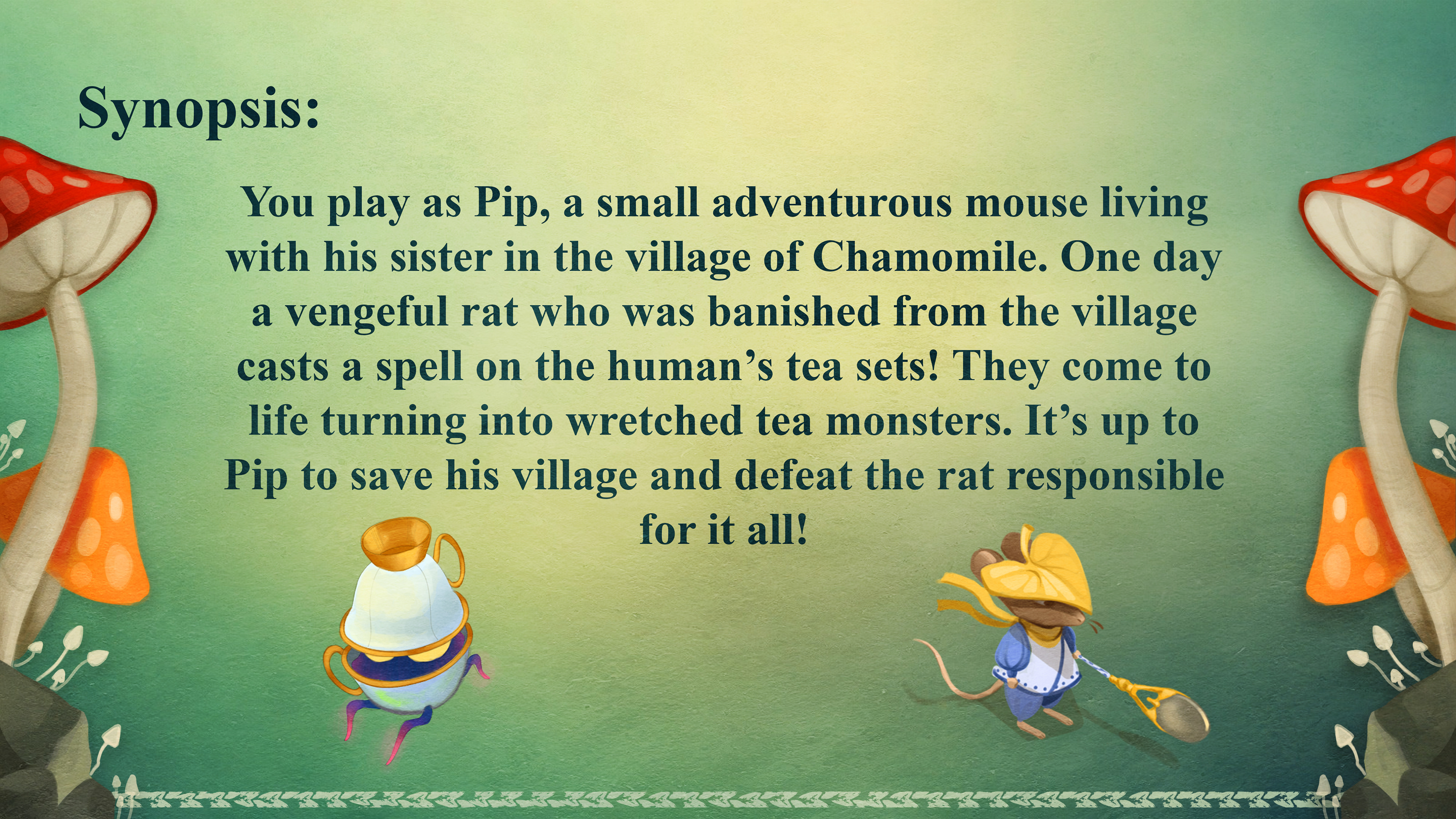 Concept for a 3D top down adventure game where players assume the role of Pip, the mouse who battles evil tea cups with his trusty teaspoon.